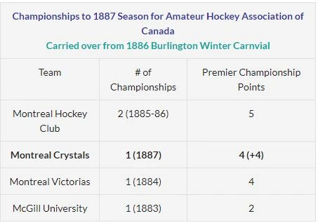 The first season played in 1887 (played from January 7 to March 11) saw The Montreal Crystals win the challenge Tournament by winning the last game of the season.[3]