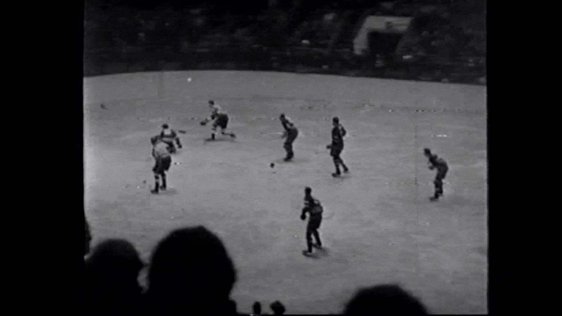 Highlights of the December 16, 1945 game between the New York Rangers and the Montreal Canadiens which the Habs took 4-2. Goalie Jim Henry of the Rangers is under siege but keeps the game close. First goal of the game by Canadiens Billy Reay is shown as the last goal by Canadiens Bob Fillion.