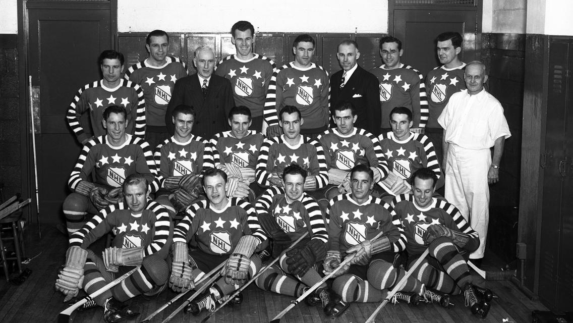 Highlights of the October 13, 1947 All-Star game which including a fight, Bill Mosienko's injury and goals by Max Bentley and the winner for the All-Stars by Doug Bentley.