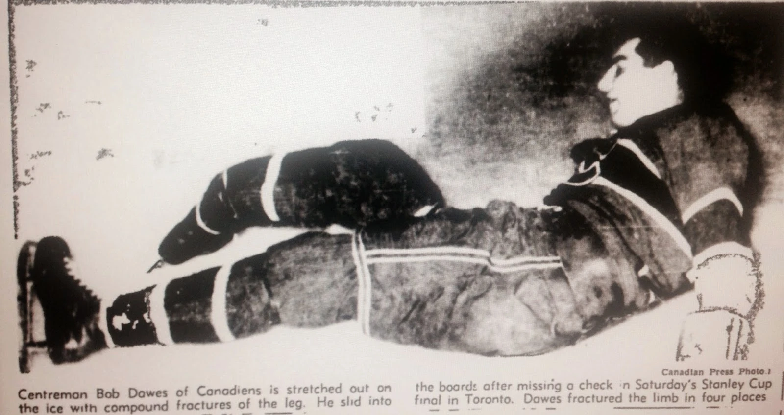 Bob Dawes suffered a compound fracture during the last game of the 1951 Stanley Cup Finals, April 21, 1951.