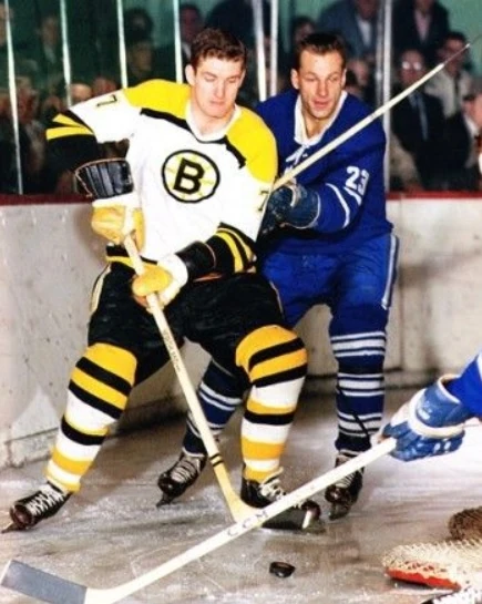 On defense, after losing Irv Spencer in the draft and trading Warren Godfrey, former All-Star Tom Johnson was obtained in the draft. He'd have an excellent campaign in his penultimate NHL season. Bob McCord also had a solid season and finished 5th in voting for the Calder Memorial Trophy. They joined Leo Boivin, newly-appointed assistant captain Ted Green and offensive threat Doug Mohns on the blueline. This was Mohns' last season with the Bruins and although a high scorer, he'd had the worst plus/minus rating on the team for the last several years. Ed Westfall continued to play both defense and right wing. Another piece in the resurgence later in the 1960's was put into place as Don Awrey made the roster out of junior.