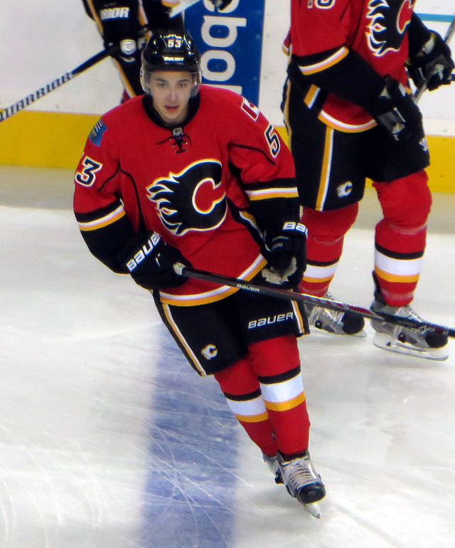 An April 1 victory over the Oilers in Edmonton not only completed a five-game season sweep of Calgary's provincial rivals, but marked the team's 22nd victory on the road and tied a franchise record set in 1988–89.[57] Two nights later, the Flames also completed a season sweep of Arizona with a 3–2 win in Calgary;[58] Sean Monahan's 31st goal of the season stood as the game-winning goal. It was his eighth such winner during the campaign, and made the 20-year-old only the fifth player in NHL history to score eight game winners in one season before the age of 21 (Wayne Gretzky, Pierre Turgeon, Eric Lindros and Sergei Samsonov being the others).[59] On the same night, the Oilers dealt a critical blow to the Los Angeles' playoff chances with a 4–2 victory in Edmonton.[60] The pair of results gave Calgary a two-point edge on the Kings and a chance to clinch a playoff spot as the teams met on April 9 in the penultimate game for each team.[61] Led once again by Hudler and Gaudreau, who combined to score all three of the Flames' goals, Calgary defeated Los Angeles 3–1. The victory not only clinched the Flames' first post-season berth in six years, but also eliminated the defending Stanley Cup champion Kings from playoff contention.[62] The regular season ended with a 5–1 defeat against the Winnipeg Jets. Three players made their NHL debuts in the contest: John Ramage, Brett Kulak and top draft pick Sam Bennett, who recorded his first NHL point just 33 seconds into the game by assisting on a goal from Micheal Ferland.[63] The Flames finished the season in third place in the Pacific Division with a record of 45–30–7.