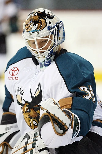 Schneider with the Manitoba Moose in a shootout against Jeremy Reich in 2009