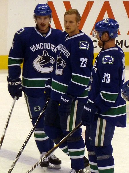 Ballard (left) stands with Canucks teammates Alex Edler and Henrik Sedin.