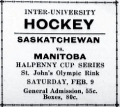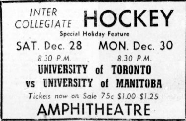 In the 1946-47 season the Bisons hosted the Toronto Varsity Blues, who were on their western tour. It was the first ever series between eastern and western university teams. On December 28th the teams tied 2-2. The Bisons won the rematch on December 30th 8-4.