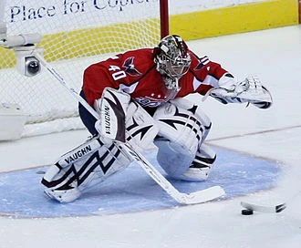 During the first round of the 2009 playoffs against the New York Rangers, Varlamov replaced José Théodore after he allowed four goals to lose Game 1.[6] He subsequently made his NHL playoff debut on 18 April 2009, losing the second game of the series 1–0. He went on to win Game 3 4–0 on 20 April, recording his first career NHL shutout. On 24 April, Game 5 of the series, Varlamov achieved his second shutout by the same score, 4–0. He won the next two games 5–3 and 2–1, respectively, to help the Washington Capitals advance to the second round of the playoffs for the first time since 1998. In Game 1 of the second round against the Pittsburgh Penguins, Varlamov made a spectacular save on Sidney Crosby that NHL pundits dubbed "the save of the playoffs."[7] In Game 7 of that series, after allowing four early goals, he was pulled in favor of deposed starter José Théodore in which the Capitals were ultimately eliminated 6–2 by the eventual Stanley Cup champions.