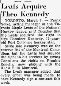 Kennedy was originally the property of the Montreal Canadiens, but was traded to the Toronto Maple Leafs in 1943 for Frank Eddolls before he had played an NHL game. This move cost Toronto General Manager Frank Selke his job, as Eddolls was a favourite of Toronto owner Conn Smythe. Nevertheless the trade was a great one for the Leafs.